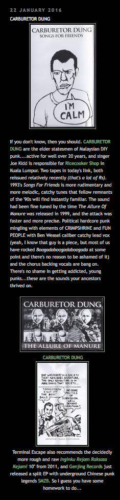 If you don’t know, then you should. CARBURETOR DUNG are the elder statesmen of Malaysian DIY punk….active for well over 20 years, and singer Joe Kidd is responsible for Ricecooker Shop in Kuala Lumpur. Two tapes in today’s link, both reissued relatively recently (that’s a lot of Rs). 1993’s Songs For Friends is more rudimentary and more melodic, catchy tunes that fellow remnants of the ’90s will find instantly familiar. The sound had been fine tuned by the time The Allure Of Manure was released in 1999, and the attack was faster and more precise. Political hardcore punk mingling with elements of CRIMPSHRINE and FUN PEOPLE with Ben Weasel caliber catchy lead vox (yeah, I know that guy is a piece, but most of us have rocked Boogadaboogadaboogada at some point and there’s no reason to be ashamed of it) and the chorus backing vocals are bang on. There’s no shame in getting addicted, young punks…these are the sounds your ancestors thrived on.